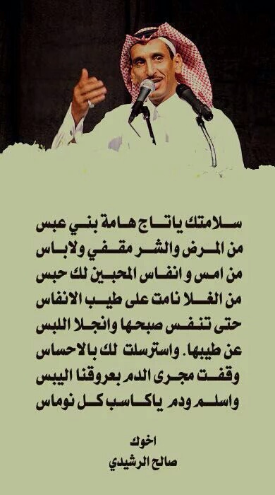مساعد_الرشيدي في تخصصي بريدة تكللت ولله الحمد بالنجاح. وطهور انشالله يابا فيصل لاباس ياامير القوافي والابيات ماجور ياتاج الشعر والرجوله طهور بإذن الله عوافي وسلامات ياللي يطول الكايده ماتطوله #شافي باني طهور جعله خطاك الشر يابارق ..الشعر..والراعد خلّ المرض .. يفتخر يالحر ! من قدّه يصير بـ #مساعد ؟ #وليد_بشير # مابأس يارأس على العز ضاري ياهامه الشعر الحقيقي فخر عبس دحيم الخياري http://www.alkfh.net/up/do.php?img=2308 |