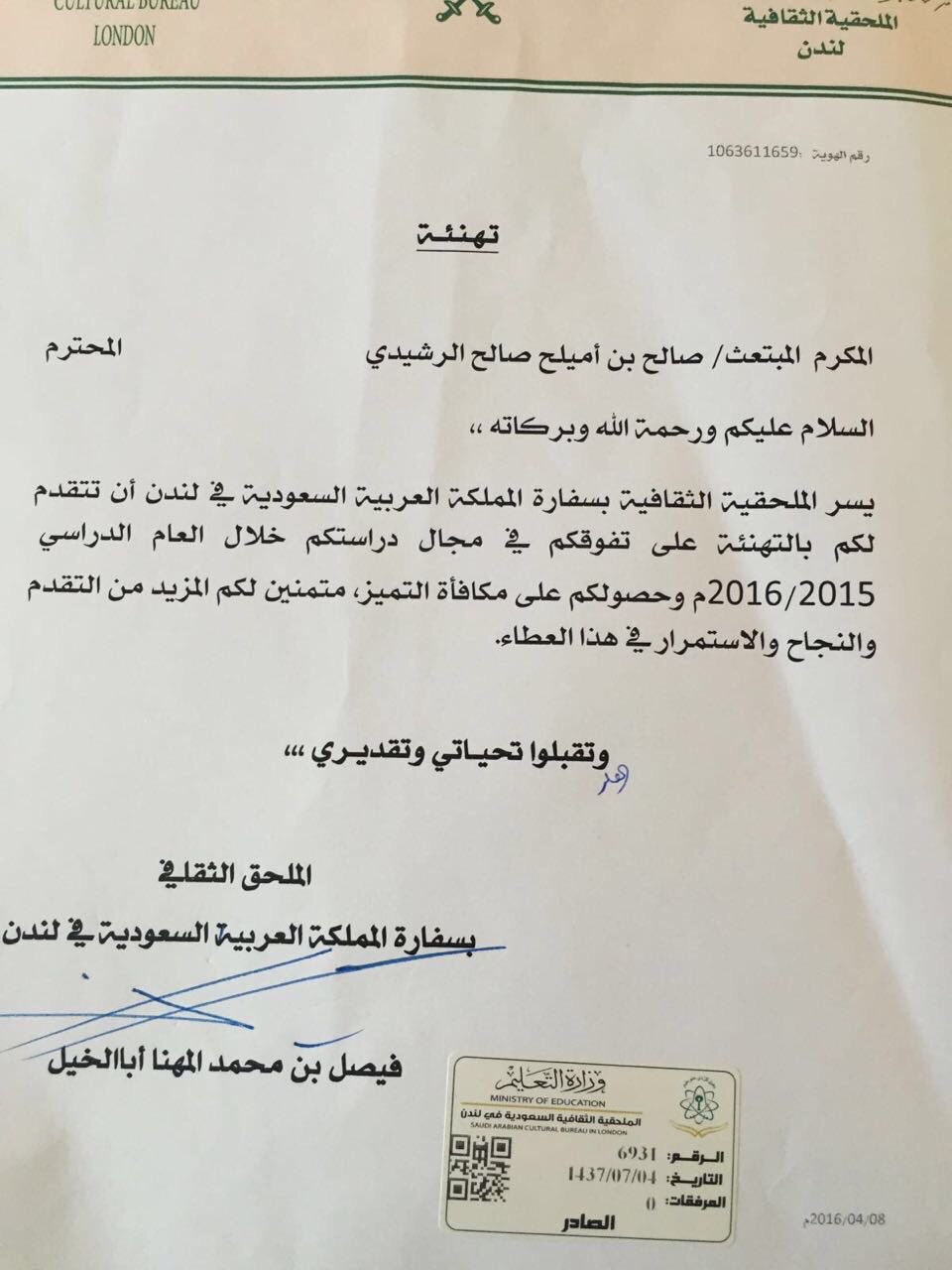 الملحقية الثقافية بلندن تهنئ ابننا صالح الرشيدي على تفوقه الدراسي وحصوله على مكافأة التميز .