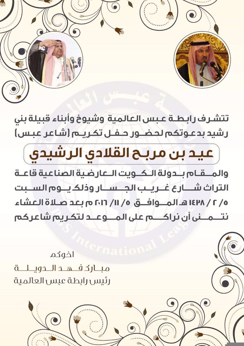رد: دعوة حفل تكريم الشاعر / عيد بن مربح القلادي الرشيدي بدولة الكويت