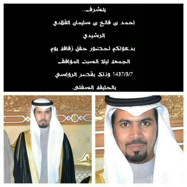 الحمدالله والصلاة والسلام ع اشرف الانبيا والمرسلين نبي محمد عليه افضل الصلاة والتسليم اما بعد: ï؟½ï؟½ï؟½ï؟½ اتشرف بدعوتكم لحفل زواجي يوم الجمعه ليلة السبت الموافق 1437/3/7 وذلك بقصر الرواسي بالحليفه السفلى. الداعي/أحمد فانخ الرشيدي دعوتكم حق علينا وحضوركم تشريف لنا http://www.alkfh.net/up/do.php?img=1761 |