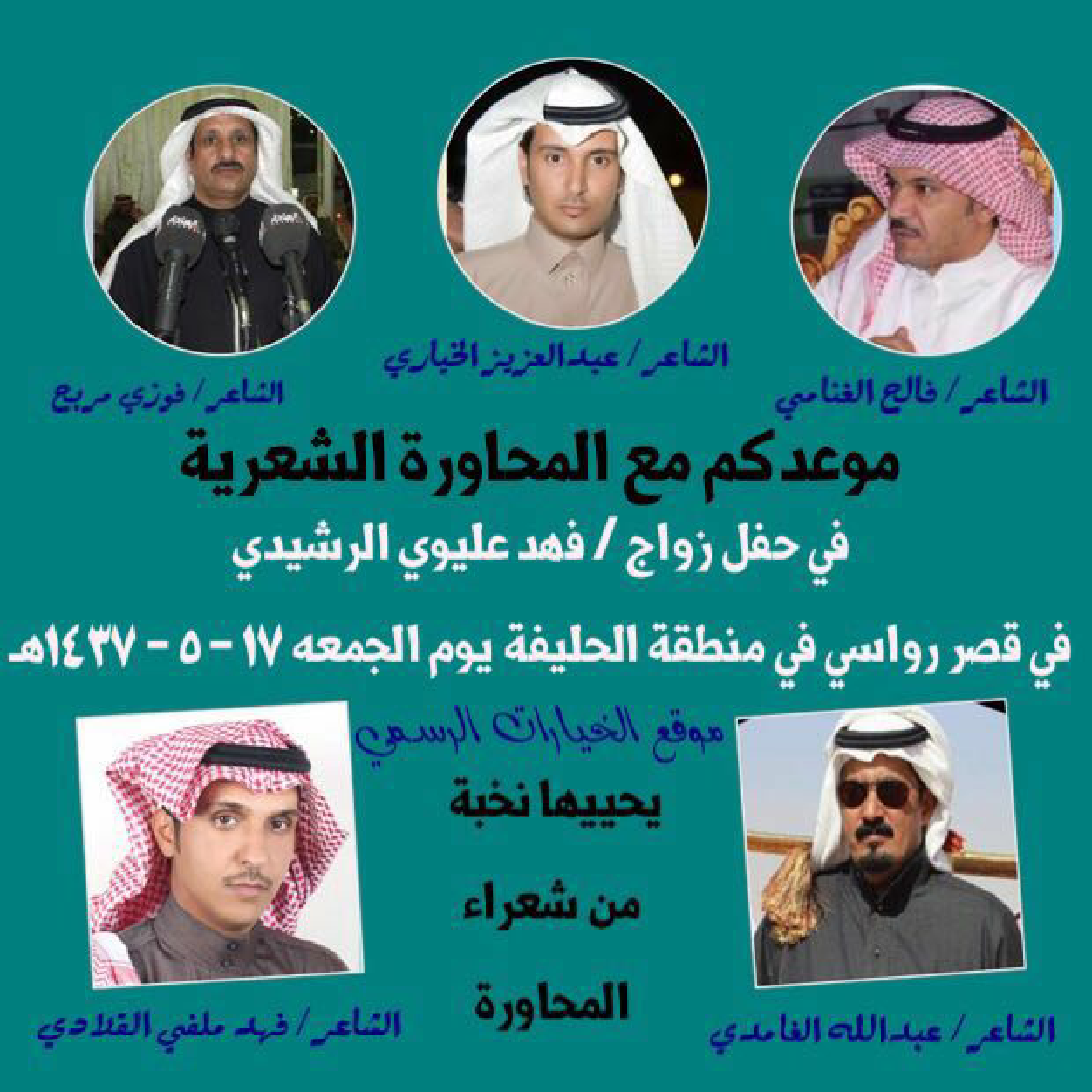 [IMG]http://www.alkfh.net/up/do.php?img=2493[/IMG] يتشرف الشيخ:عليوي معلا الرشيدي بدعوتكم لحضور حف زفاف ابنه الشاب(فهد) وذلك يوم الجمعه ليلة السبت1437 5/17 في قصر الرواسي الاحتفالات مدينه الحليفه السفلئ و بحضوركم يتم لنا الفرح والسرور. والعاقبه لديكم بالمسرات و يحي الحفل نخبه من الشعراء الداعي:عليوي معلا القلادي الرشيدي [IMG] http://www.alkfh.net/up/do.php?img=2492[/IMG] |