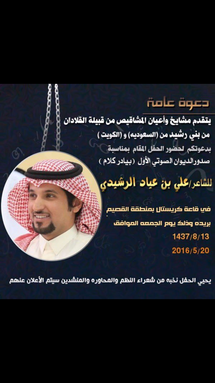 الله يعطيك العافيه ويبيض وجهكك ياماجد البويدي على نقل الدعوة والله يوفق شاعرنا علي بن عياد الرشيدي |