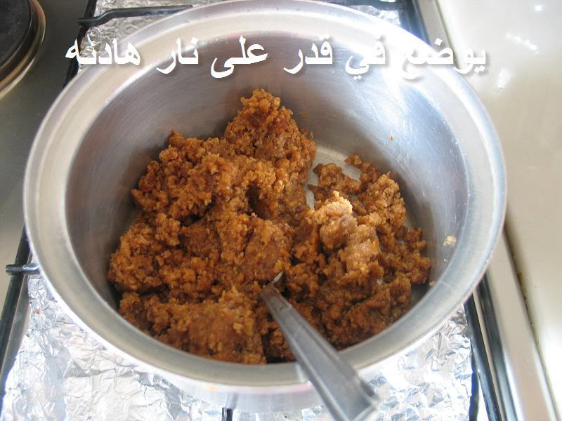 طريقة عمل (( الحنيني )) المقادير: 3كاسات دقيق بر تمر منزوع النوى (من كاس الى كاس ونصف على حسب الذوق الشخصي ) ماء للعجن ذرة ملح نصف كاس زبده ذائبه الطريقه: يعجن الدقيق +الملح+الماء حتى يتكون لدينا عجينه لينه ثم نحمي الصاج ونقوم بترصيع الخبز الى اقراص ويكون قطر القرص شبر تقريبا ويحمر من الوجهين وممكن بدل ماتسوي خبز تشتري خبز جاهز خبز خاص للقرصان ويكون لين بدل ماتسوين خبز علشان كذا انا ماصورت لكم الخطوه هذي تجمع الاقراص ثم تقطع وتخلط مع التمر ويصب عليها بعض الزبده ثم تطحن في فرامة اللحم يوضع في قدر على النار ويوضع عليه بقية الزبه ويترك على نار هادئه جدا مع التحريك من وقت لاخر لمدة نصف ساعه بعد كذا يوضع في صحون التقديم ويقدم بالهناء والشفاء ملاحظه: اذاتم وضع 3تمرات داخل كل قرص فان حلاه يكون موزون |