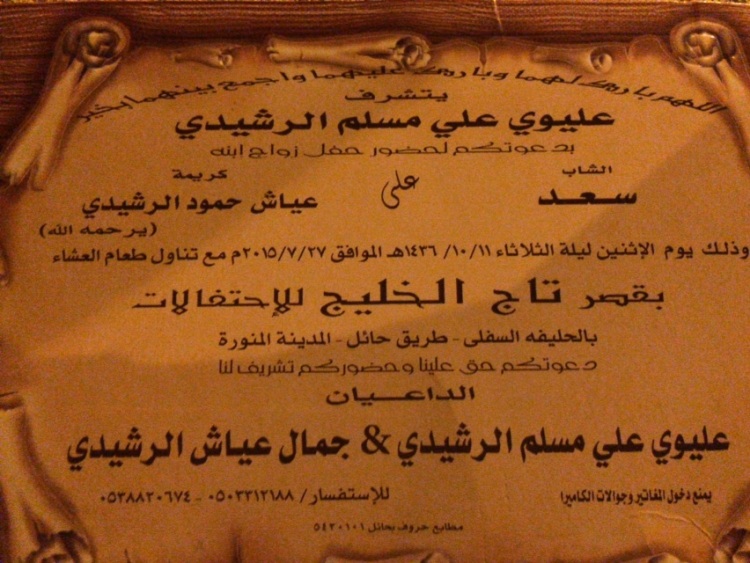 يتشرف الشيخ عليوي بن على بن مسلم البويدي بدعوتكم لحضور زواج ابه الاستاذ: سعد