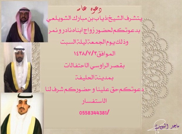 دعوه عامه لحضور زواج ابنا الشيخ: ذياب مبارك شويلعي