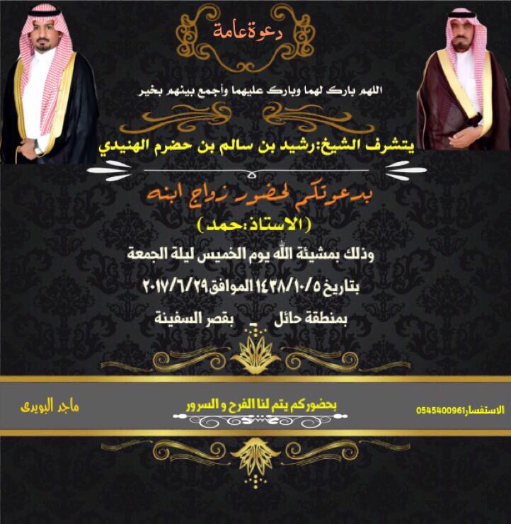 دعوة لحضور زواج الاستاذ حمد بن رشيد بن سالم بن حضرم الهنيدي البويدي القلادي