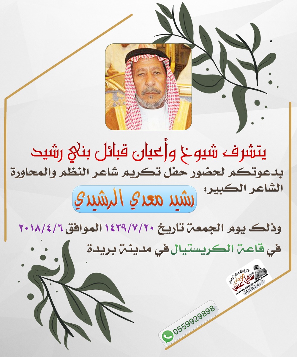 رد: دعوة عامه لحضور حفل تكريم الشاعر الكبير:رشيد بن معدي القلادي