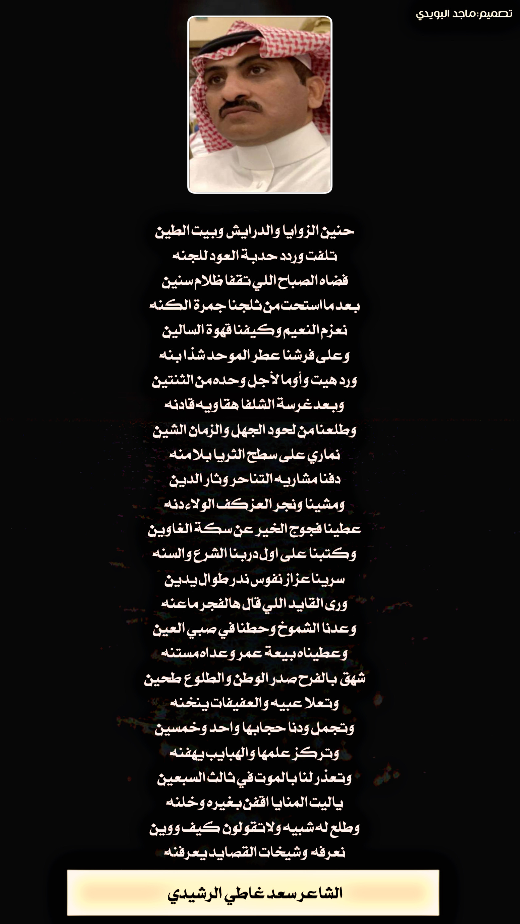 اقدم لكم قصيدة للشاعر سعد بن غاطي بن عمير القلادي حنين الزوايا والدرايش وبيت الطين تلفت وردد حدبة العود للجنه فضاه الصباح اللي تقفا ظلام سنين بعد مااستحت من ثلجنا جمرة الكنه نعزم النعيم وكيفنا قهوة السالين وعلى فرشنا عطر الموحد شذا بنه ورد هيت وأوما لأجل وحده من الثنتين وبعدغرسة الشلفا هقاويه قادنه وطلعنا من لحود الجهل والزمان الشين نماري على سطح الثريا بلا منه دفنا مشاريه التناحر وثار الدين ومشينا ونجر العزكف الولاء دنه عطينا فجوج الخير عن سكة الغاوين وكتبنا على اول دربنا الشرع والسنه سريناعزاز نفوس ندر طوال يدين ورى القايد اللي قال هالفجر ماعنه وعدنا الشموخ وحطنا في صبي العين وعطيناه بيعة عمر وعداه مستنه شهق بالفرح صدر الوطن والطلوع طحين وتعلا عبيه والعفيفات ينخنه وتجمل ودنا حجابها واحد وخمسين وتركز علمها والهبايب يهفنه وتعذر لنا بالموت في ثالث السبعين ياليت المنايا اقفن بغيره وخلنه وطلع له شبيه ولاتقولون كيف ووين نعرفه وشيخات القصايد يعرفنه http://www.alkfh.net/up/do.php?img=8190 |