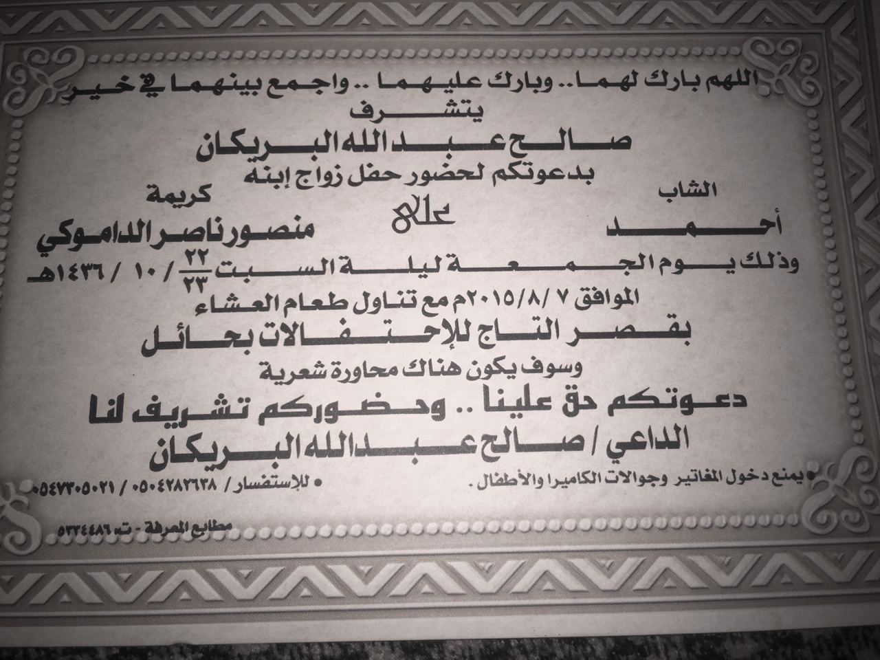 يتشرف الشيخ صالح بن عبدالله بن بريكان بن عجوين بدعوتكم لحضور زواج ابنه الاستاذ:أحمد وذلك بمدينة حائل يوم الجمعة ليلة السبت بتاريخ 22/10/1436هـ بقصر التاج للاحتفالات